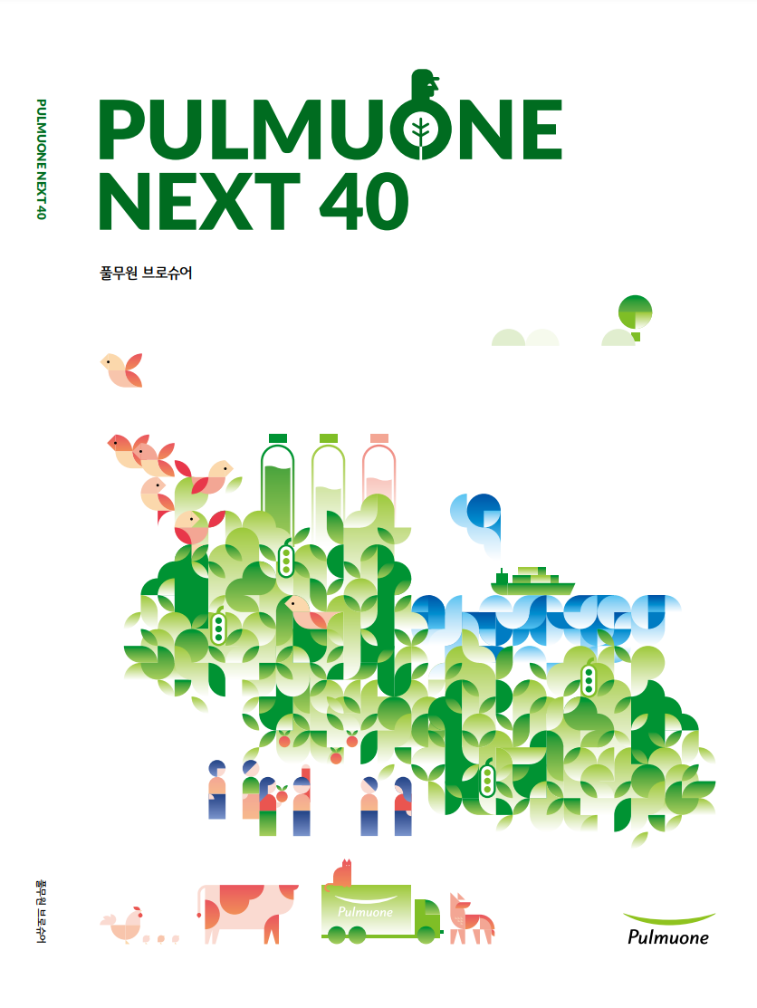 창사 40주년을 기념하여 풀무원의 지속가능한 비즈니스 전략과 주요 제품, 서비스를 소개하는 전사 브로슈어 'Pulmuone Next 40'을 발간했습니다. 이해관계자 여러분께서 풀무원의 비즈니스 현황을 보다 쉽고 빠르게 파악하실 수 있도록 향후 풀무원 브로슈어는 통합보고서의 요약 버전이 아닌 별도의 발간물로 제작될 예정입니다.