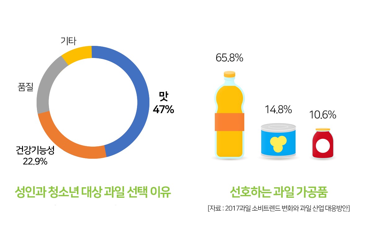 여기에 최근 높아지고 있는 컬러푸드에 대한 관심과 건강 기능성을 갖춘 새로운 과일을 찾는 소비자들의 수요가 맞물리며 다양한 열대 과일의 소비가 확대되고 있다. 특히 건강 기능성은 소비자들이 과일을 선택하는 데 있어 맛 못지 않게 중요하게 생각하는 기준인 것으로 나타났다. 한국농촌경제연구원이 발행한 ‘2017-과일 소비트렌드 변화와 과일 산업 대응방안’에 의하면 성인과 청소년의 과일 선택 기준 중 맛이 47%로 1위를 차지했지만 건강기능성도 22.9%로 매우 높은 편이었다.