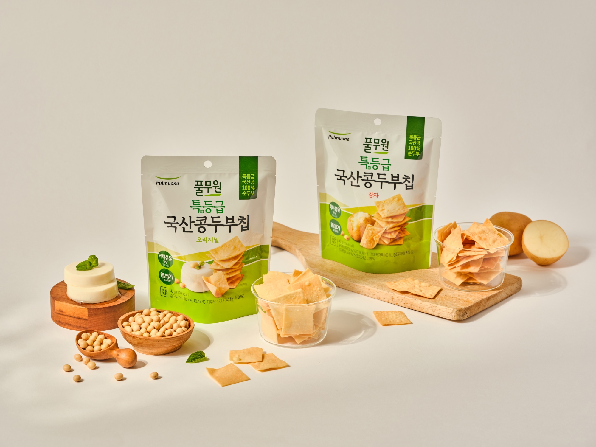 ‘특등급 국산콩 두부칩’(40g/2,980원) 2종(오리지널, 감자)은 특등급 국산콩 100%로 만든 풀무원 순두부를 통째로 넣고 반죽한 다음, 오븐에 3번 구워낸 두부스낵 제품이다. 담백하고 고소한 맛이 특징이며, 바삭한 식감이 먹는 재미를 더해준다.