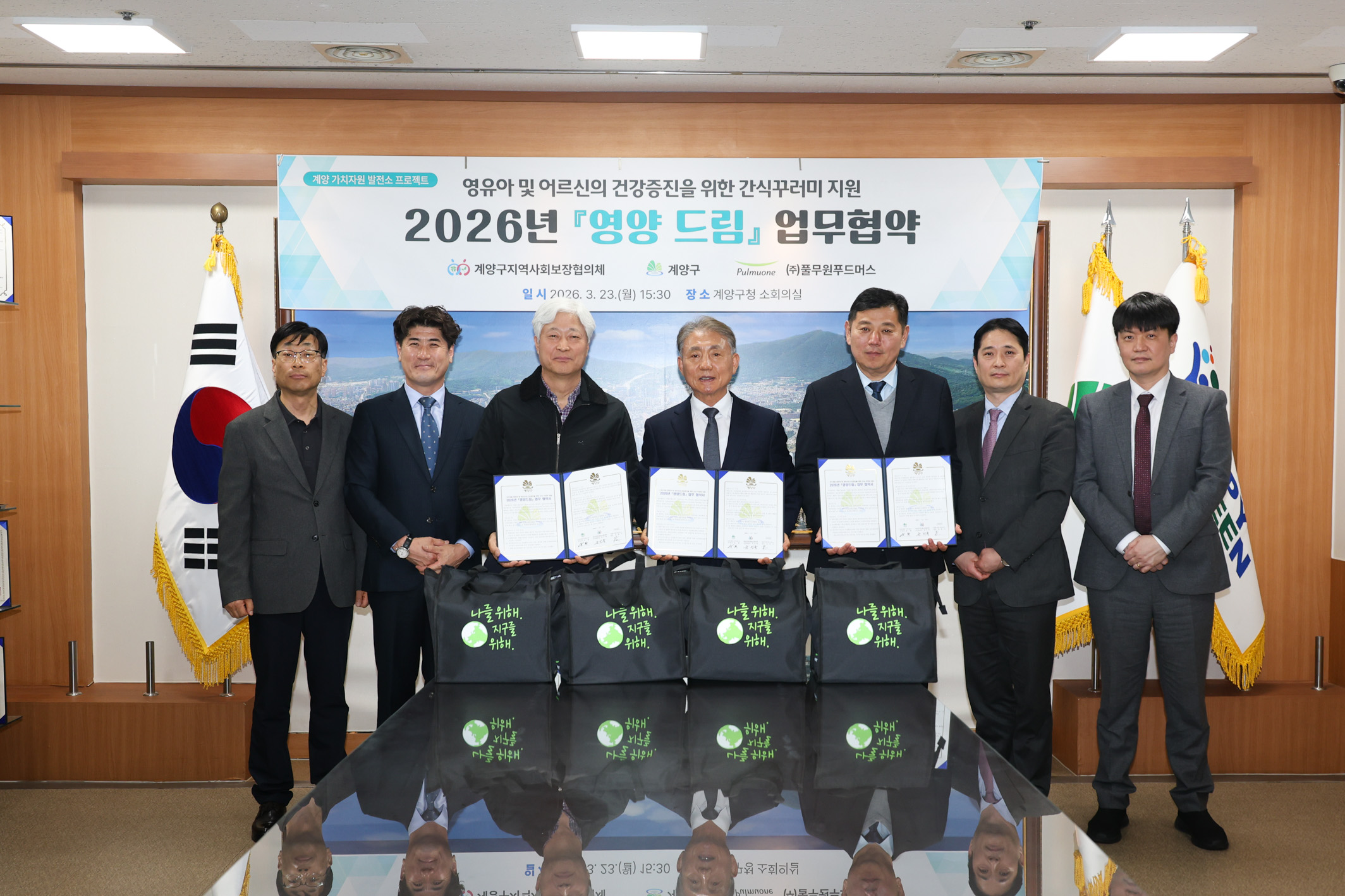풀무원 계열 식자재 유통기업 풀무원푸드머스는 인천광역시 계양구청, 계양구지역사회보장협의체와 저소득층 영유아 가정 및 노인들에게 간식 꾸러미를 지원하는 ‘영양 드림’ 사업 공동 추진을 위한 업무협약을 체결했다고 24일 밝혔다.